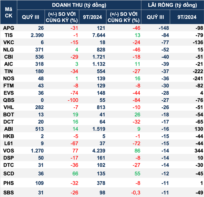 Tính tới trưa 24/10, có trên 90 doanh nghiệp thua lỗ trong quý vừa qua như: Chứng khoán APG (Mã: APG), Tisco (Mã: TIS), Nam Long (Mã: NLG), VKC Holdings (Mã: VKC), Tổng CTCP Bảo hiểm Hàng không (Mã: AIC), Công ty Tài chính cổ phần Tín Việt (Mã: TIN), Chứng khoán Everest (Mã: EVS), Viglacera Hạ Long (Mã: VHL), CTCP Vận tải Biển Việt Nam (Mã: VOS), Nhiệt điện Hải Phòng (Mã: HND),...