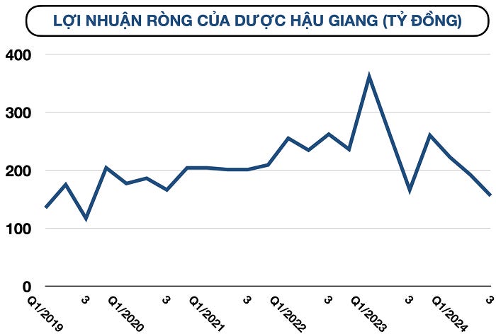 Quý III, CTCP Dược Hậu Giang ghi nhận doanh thu thuần giảm hơn 3% so với cùng kỳ xuống còn 1.062 tỷ đồng. Doanh nghiệp dược này báo lãi sau thuế 156 tỷ đồng, giảm 6% so với quý III/2023 và cũng là con số thấp nhất kể từ quý IV/2019.