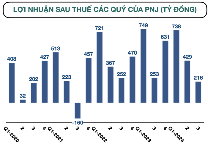 Lợi nhuận quý của PNJ rơi về mức thấp nhất 3 năm. Trong quý III, PNJ ghi nhận doanh thu thuần đạt 7.130 tỷ đồng, tăng 3% so với cùng kỳ song lợi nhuận sau thuế giảm gần 15% xuống còn 216 tỷ đồng. Đây cũng là mức lợi nhuận quý thấp nhất kể từ quý IV/2021 của PNJ.