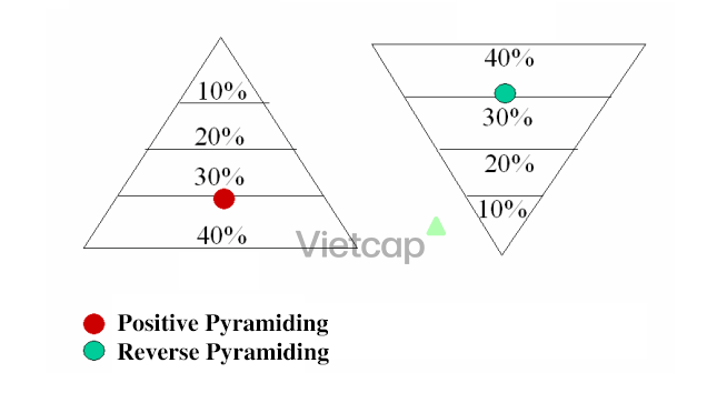 Kim tự tháp dương (Positive Pyramiding): Nhà giao dịch gia tăng vị thế khi giá di chuyển theo hướng có lợi. Lần đầu tiên, họ có thể mua 40% vị thế dự định, sau đó mua thêm 30% khi giá tăng, rồi 20% và cuối cùng là 10%. Cách tiếp cận này giúp hạn chế rủi ro khi giá đảo chiều.