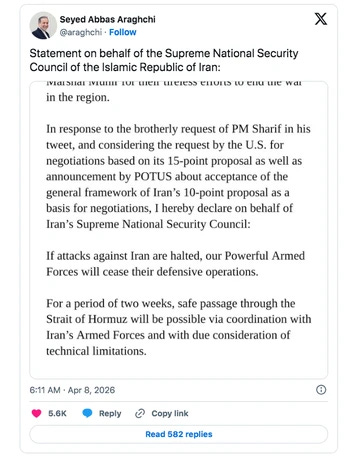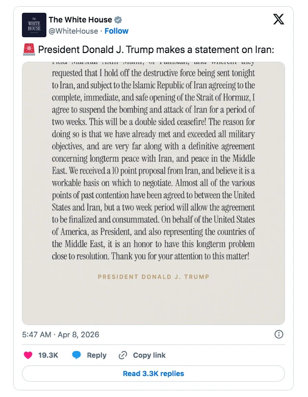 “Dựa trên các cuộc trao đổi với Thủ tướng Shehbaz Sharif và Tổng Tham mưu trưởng Asim Munir của Pakistan, trong đó họ đề nghị tôi tạm hoãn lực lượng tấn công dự kiến triển khai tối nay tới Iran, và với điều kiện Cộng hòa Hồi giáo Iran đồng ý MỞ LẠI HOÀN TOÀN, NGAY LẬP TỨC và AN TOÀN eo Hormuz, tôi đồng ý tạm dừng các cuộc ném bom và tấn công Iran trong thời hạn hai tuần. Đây sẽ là một lệnh NGỪNG BẮN hai chiều.