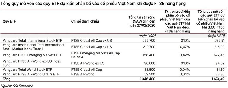 Theo FTSE Russell, Việt Nam ước tính chiếm tỷ trọng 0,037% trong rổ FTSE Global All Cap; 0,024% trong FTSE All-World; 0,35% thuộc FTSE Emerging All Cap và 0,227% rổ FTSE Emerging Index. Các tỷ trọng này đều cao hơn so với lần cập nhật thông tin nâng hạng hồi tháng 11/2025.