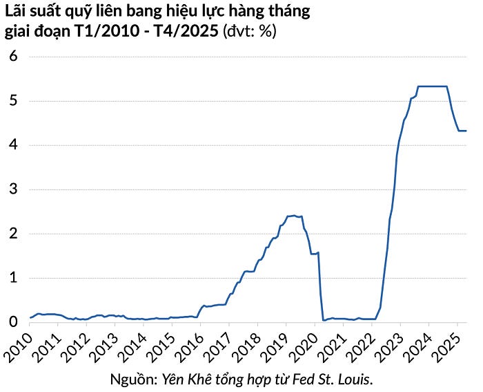 Sau cuộc khủng hoảng tài chính năm 2008, Fed duy trì lãi suất chính sách gần bằng 0 trong suốt 7 năm. Để so sánh, kể từ tháng 12/2024 tới nay, lãi suất của Fed dao động trong phạm vi 4,25% - 4,5%.