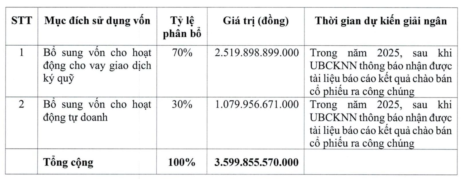 Cụ thể, Công ty dự kiến phân bổ gần 2.520 tỷ đồng (tỷ lệ 70%) bổ sung vốn cho hoạt động cho vay giao dịch ký quỹ và gần 1.080 tỷ đồng (tỷ lệ 30%) bổ sung vốn cho hoạt động tự doanh. Thời gian giải ngân dự kiến trong năm 2025.