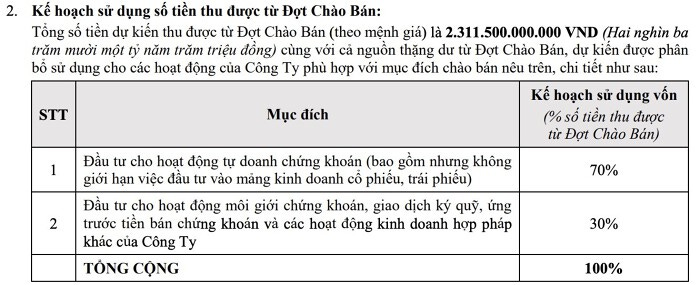 Số tiền thu được từ đợt phát hành sẽ được TCBS sử dụng cho các hoạt động cốt lõi. Cụ thể, khoảng 70% sẽ được phân bổ cho hoạt động tự doanh. Phần còn lại sẽ phục vụ cho hoạt động môi giới chứng khoán, giao dịch ký quỹ, ứng trước tiền bán và các mảng kinh doanh khác.