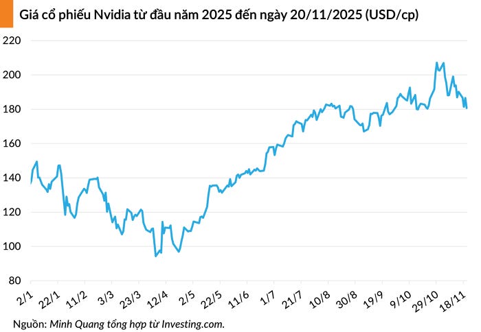 Tuy nhiên, cổ phiếu Nvidia lại đóng cửa giảm 3%, bất chấp lời trấn an của CEO Jensen Huang rằng nhu cầu đối với dòng chip Blackwell của hãng đang “vượt ngoài dự kiến”. Ông cũng bác bỏ ý tưởng về bong bóng AI.