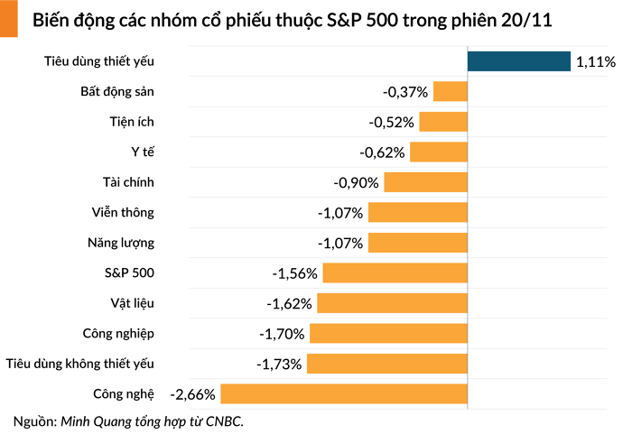 Chỉ số S&P 500 giảm 1,56% xuống còn 6.539 điểm, mặc dù trước đó từng tăng tới 1,9%. Chỉ số thiên về công nghệ Nasdaq Composite mất 2,16% và chốt phiên với 22.078 điểm, giảm đáng kể với mức tăng 2,6% vào đầu phiên.