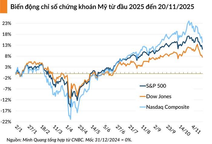 Theo CNBC, trong phiên giao dịch ngày 20/11, chỉ số trung bình công nghiệp Dow Jones đã giảm 387 điểm, tương đương 0,84%, xuống còn 45.752 điểm. Đầu phiên, có lúc chỉ số này từng tăng hơn 700 điểm.