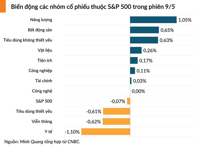 Theo CNBC, trong phiên giao dịch ngày 9/5, chỉ số trung bình công nghiệp Dow Jones mất 119 điểm, tương đương 0,29% và đóng cửa ở mức 41.249 điểm. Chỉ số S&P 500 giảm nhẹ 0,07% và chốt phiên 5.660 điểm. Chỉ số thiên về công nghệ Nasdaq Composite gần như đi ngang, chốt phiên ở mức 17.929 điểm.