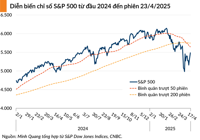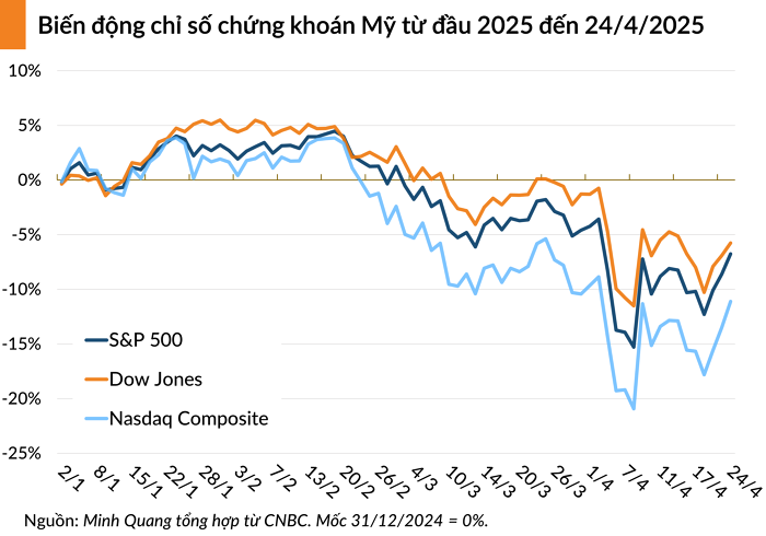 Kể từ khi ông Trump công bố chính sách thuế quan đối ứng vào ngày 2/4, chỉ số S&P 500 đã giảm 3,3%, Dow Jones mất 5,1% còn Nasdaq Composite đi xuống 2,5%. Tuy nhiên, trong hai tuần gần đây, các chỉ số có dấu hiệu phục hồi và hiện đang trên đà có tuần tích cực thứ hai liên tiếp.