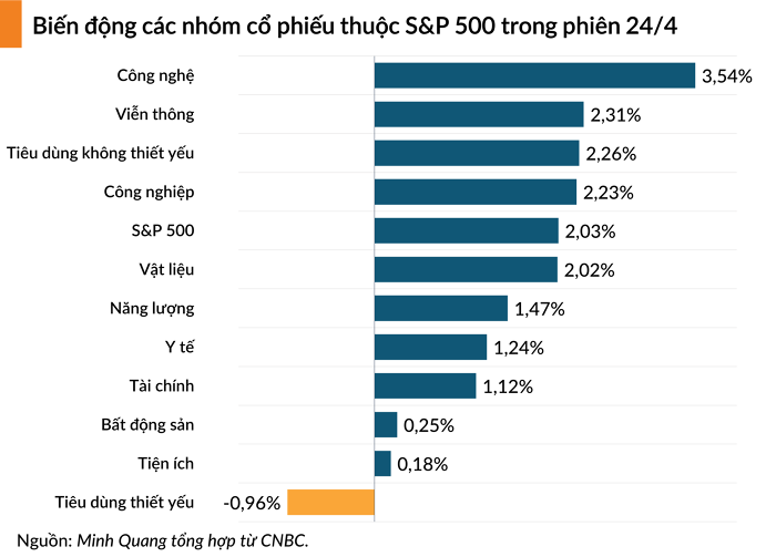 Theo CNBC, trong phiên giao dịch ngày 24/4, chỉ số S&P 500 tăng 2,03% lên 5.485 điểm. Trong khi đó, chỉ số thiên về công nghệ Nasdaq Composite tiến thêm 2,74%, đóng cửa với 17.166 điểm.