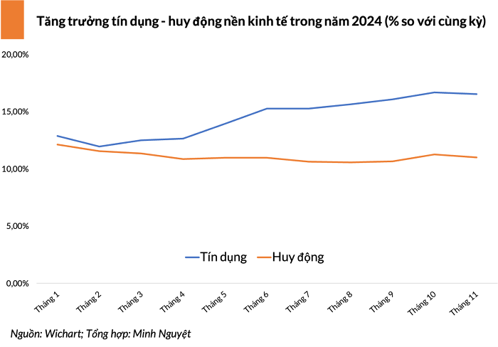 Nhìn vào năm 2024, mặc dù tăng trưởng tín dụng gần đạt mục tiêu, nhưng sự chênh lệch giữa tăng trưởng tín dụng và huy động vốn lại khá xa.