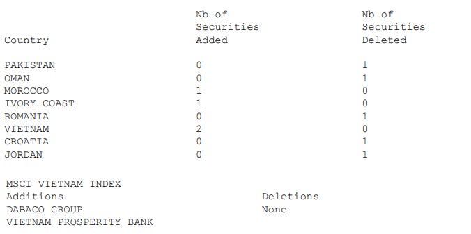Nhóm cổ phiếu Việt Nam được bổ sung 8 mã gồm DL1, MCM, VC3, PVP, CSM, HT1,VTZ, và HVT; đồng thời 6 mã bị loại gồm INN, CLL, DBC, GKM, OCH, và TDM. Lưu ý trường hợp DBC bị loại do chuyển sang rổ MSCI Frontier Markets Index.