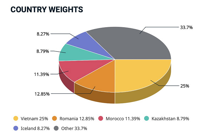 Dữ liệu từ MSCI cho thấy tại cuối tháng 10, Việt Nam vẫn là quốc gia chiếm tỷ trọng cao nhất trong MSCI Frontier Market Index với tỷ lệ 25%. Kế đến là Romania gần 13%, Marocco hơn 11%, Kazakhstan gần 9%. Trong top 10 cổ phiếu chiếm tỷ trọng lớn nhất, Việt Nam góp mặt HPG của Tập đoàn Hòa Phát và VHM của Vinhomes, lần lượt xếp thứ 4 và thứ 8.