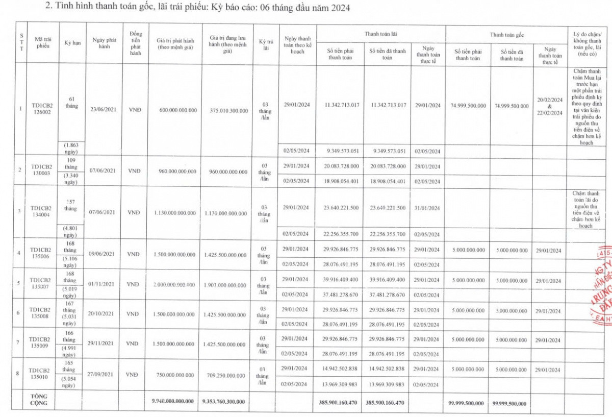 Tình hình thanh toán trái phiếu 6 tháng đầu năm 2024 của Trung Nam Đắk Lắk 1