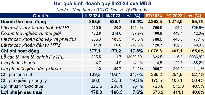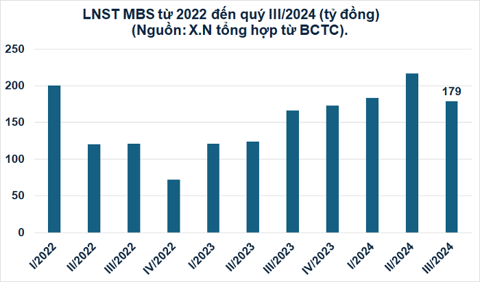 MBS ghi nhận lợi nhuận sau thuế quý III đạt 179 tỷ đồng, tăng 8% so với cùng kỳ năm trước, song giảm 8% so với quý II liền trước. Như vậy, lợi nhuận MBS chững lại sau chuỗi 6 quý đi lên liên tiếp.