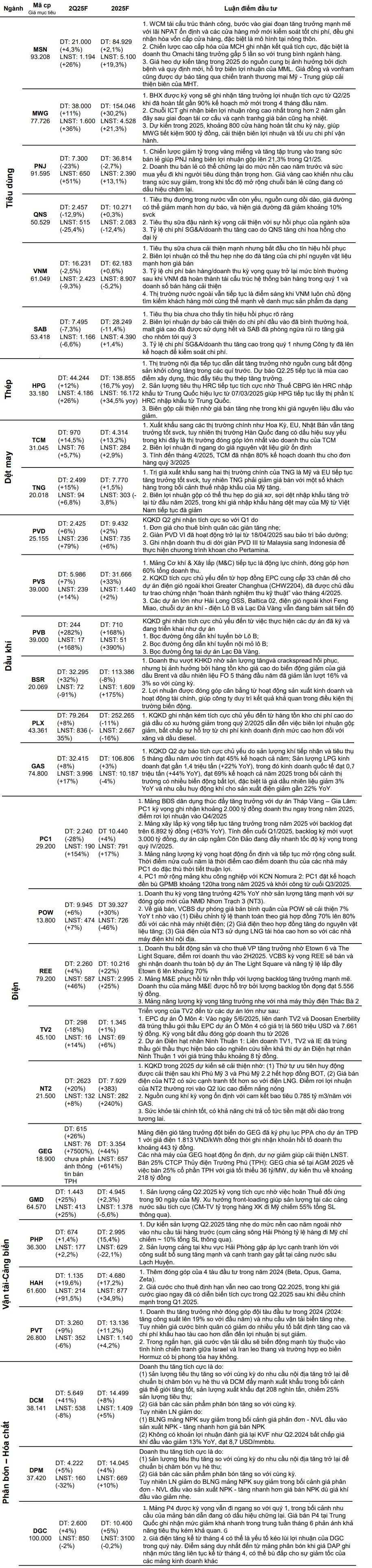Tại nhóm thép , HPG dự kiến sẽ ghi nhận lợi nhuận sau thuế đạt 4.186 tỷ đồng trong quý 2/2025, tăng trưởng 26% trong bối cảnh tiêu thị tại thị trường nội địa tốt trong bối cảnh nguồn cung bất động sản khởi công tăng. VCBS dự báo quý 2 tiếp tục là mùa cao điểm xây dựng, thúc đẩy tiêu thụ thép tăng trưởng. Sản lượng tiêu thụ HRC cũng sẽ tiếp tục tích cực nhờ thuế CBPG lên HRC nhập khẩu từ Trung Quốc hiệu lực từ 7/3/2025 giúp HPG tiếp tục lấy thị phần từ HRC nhập khẩu từ Trung Quốc. Biên LN gộp của HPG cũng được cải thiện nhờ giá bán tăng nhẹ trong khi giá nguyên liệu đầu vào giảm.