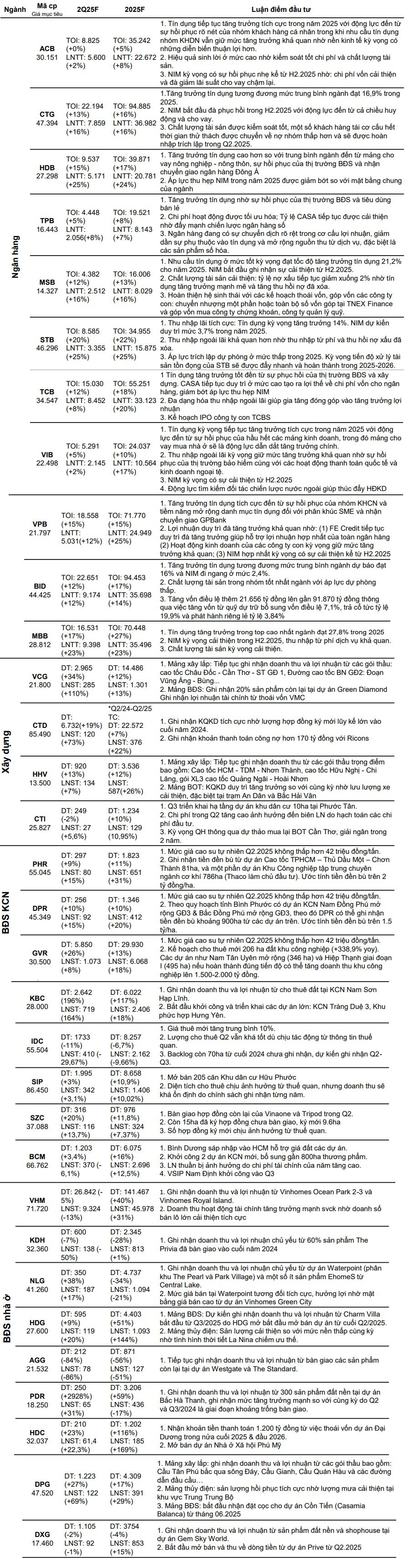 Trong số các doanh nghiệp BĐS nhà ở, PDR được kỳ vọng sẽ ghi nhận doanh thu và lợi nhuận từ 300 sản phẩm đất nền tại dự án Bắc Hà Thanh, từ đó đạt mức tăng trưởng mạnh so với cùng kỳ do quý 2 và quý 3 năm ngoái là giai đoạn khoảng trống bàn giao. LNST quý 2/2025 dự báo đạt 65 tỷ. DPG cũng được dự phóng tăng trưởng LNST 69% lên 122 tỷ đồng trong quý này. Mảng xây lắp của DPG ghi nhận doanh thu và lợi nhuận từ các gói thầu bao gồm: Cầu Tân Phú bắc qua sông Đáy, Cầu Gianh, Cầu Quán Hàu và các đường dẫn đầu cầu… Đồng thời, sản lượng thủy điện hồi phục tích cực nhờ lượng mưa cải thiện tại khu vực Trung Trung Bộ 3. Tại mảng BĐS, DPG đã bắt đầu nhận đặt cọc cho dự án Cồn Tiến (Casamia Balanca) từ tháng 6/2025.