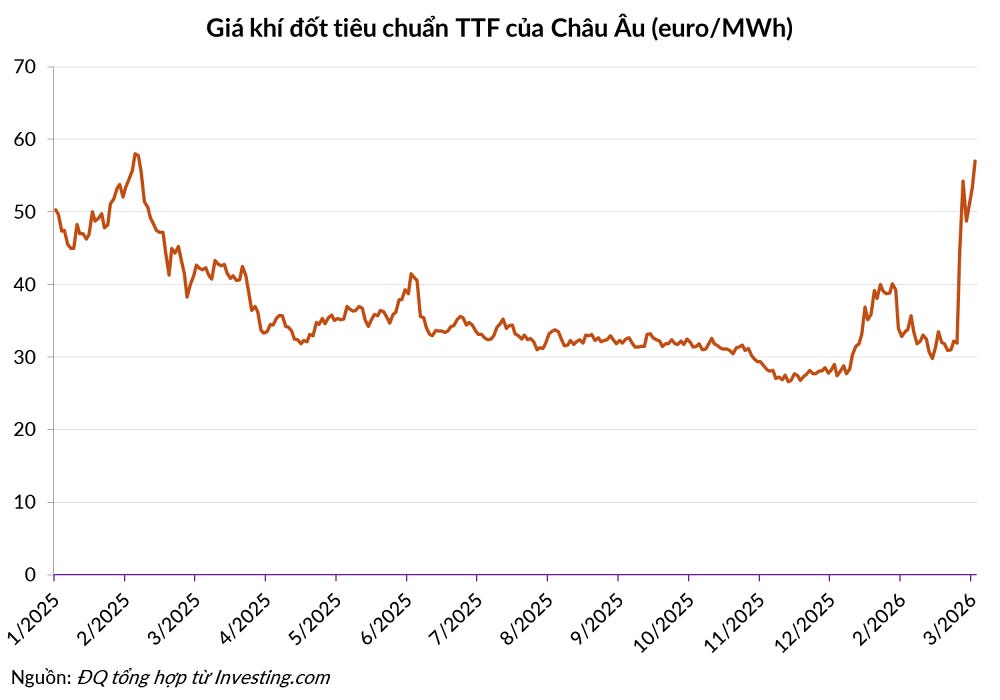 Trên bảng điện tử, giá khí đốt tiêu chuẩn TTF của Châu Âu đã tăng vọt 60% chỉ trong vài ngày, tiến gần ngưỡng 60 euro/MWh và các hợp đồng giao tháng 4 ghi nhận mức tăng gần gấp đôi.