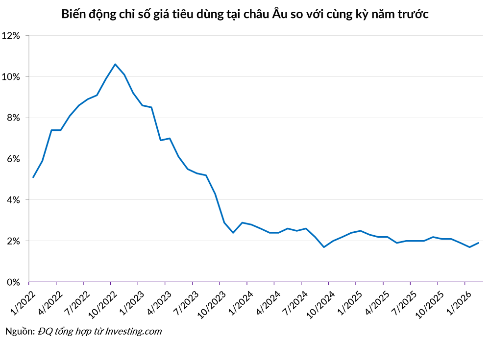 Tỷ lệ lạm phát tháng 2 của khu vực Eurozone là 1,9%. Theo các mô hình phân tích của Ngân hàng Trung ương Châu Âu (ECB) và ING, nếu giá dầu và khí đốt duy trì đà tăng, lạm phát tại Eurozone có nguy cơ bị đẩy tăng thêm từ 0,5 đến 1 điểm phần trăm.