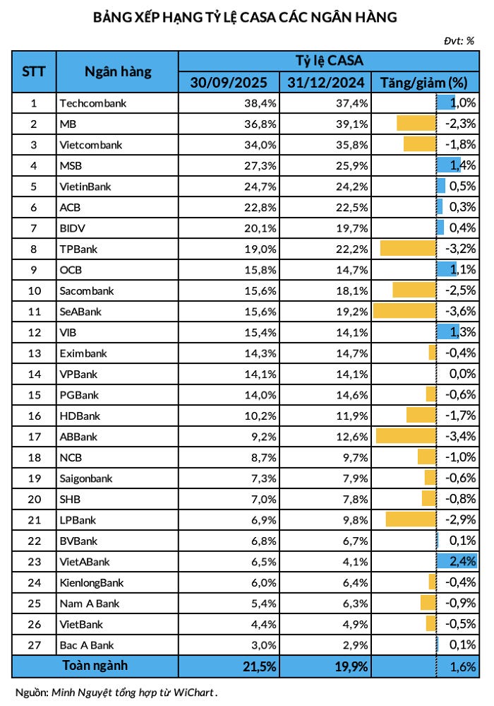 Tính đến ngày 30/9/2025, tỷ lệ CASA tiếp tục có sự phân hoá rõ rệt giữa các nhóm ngân hàng. Theo số liệu Wichart tính toán từ số liệu của 27 ngân hàng đã công bố báo cáo tài chính quý III, tỷ lệ CASA của nhóm ngân hàng này đạt 21,49%, tăng 1,59 điểm % so với thời điểm đầu năm.