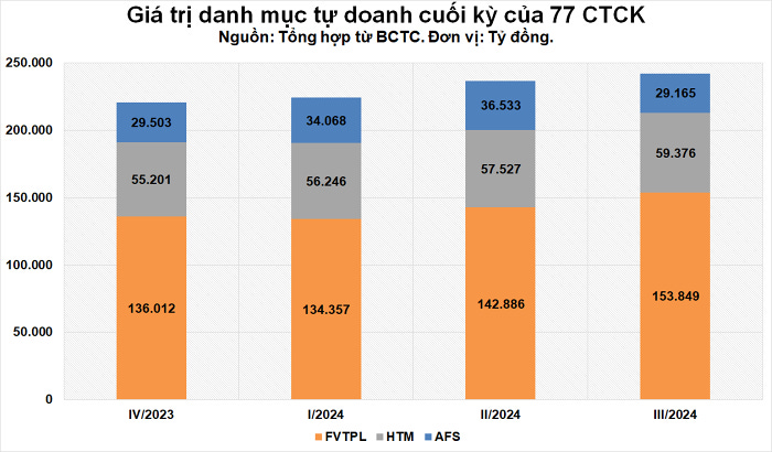 Theo thống kê của người viết, tổng giá trị tài sản tự doanh của 77 CTCK tại thời điểm cuối tháng 9 đạt xấp xỉ 242.400 tỷ đồng (khoảng 9,7 tỷ USD), tăng 10% so với cuối năm 2023 và tăng 2% so với cuối quý II.