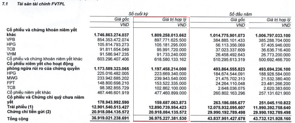 Cũng phân bổ tỷ trọng lớn vào FVTPL còn có VPBankS, VIX, SHS hay HSC. Toàn bộ mảng tự doanh của HSC là FVTPL, với giá trị gần 8.200 tỷ đồng, trong đó, phần lớn là trái phiếu với hơn 5.300 tỷ đồng. VIX gần như chỉ ghi nhận tài sản tự doanh tại FVTPL (tỷ trọng 99,9%), với gần 40% danh mục là cổ phiếu.