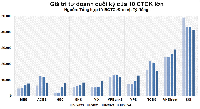 Top 10 đơn vị có khoản tự doanh lớn nhất chiếm hơn 151.600 tỷ đồng, tương đương 63% giá trị tự doanh toàn ngành. Chứng khoán Thành phố Hồ Chí Minh (HSC - Mã: HCM) và Chứng khoán MB (Mã: MBS) đã lọt vào top 10, thay thế Chứng khoán Vietcap (Mã: VCI) và Chứng khoán Vietcombank (VCBS).