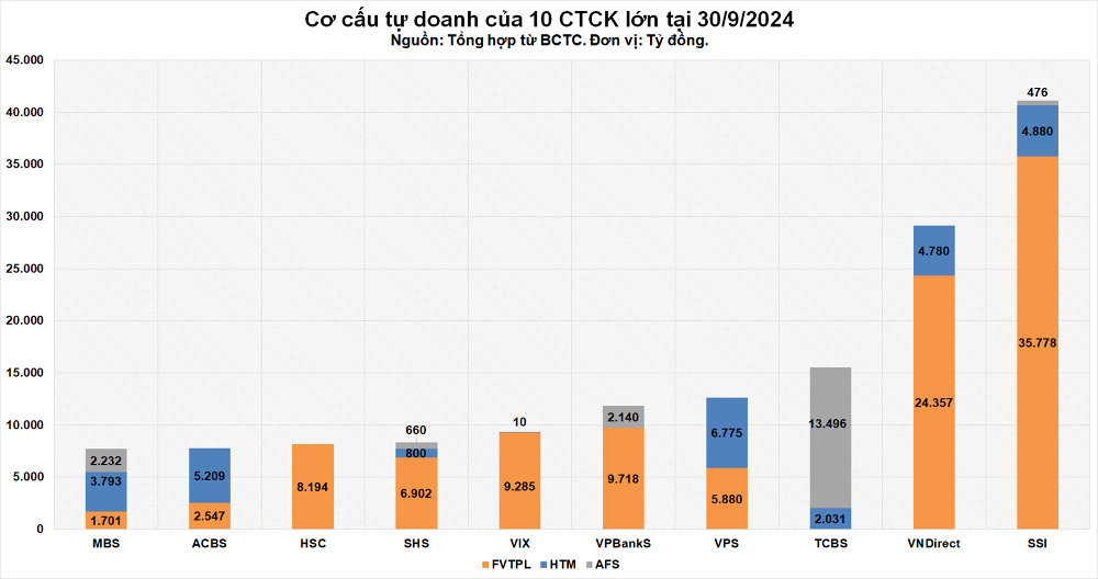 Phần lớn danh mục tự doanh của các CTCK đều gồm các tài sản ít hoặc không biến động như trái phiếu, chứng chỉ tiền gửi, công cụ thị trường tiền tệ, tiền gửi ngân hàng; trong khi đó, phần cổ phiếu thường không chiếm tỷ lệ lớn. Về cơ cấu giữa ba loại tài sản FVTPL, HTM và AFS, đa số các đơn vị ghi nhận giá trị lớn nhất tại FVTPL.