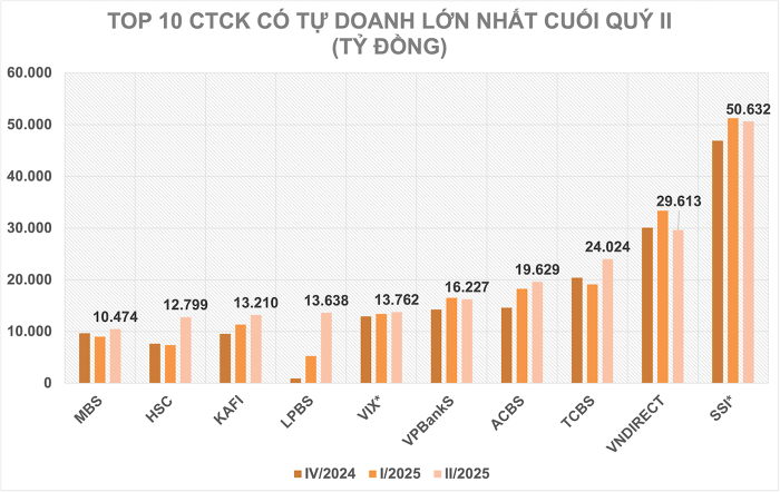 Tại từng công ty cụ thể, phân bổ danh mục cho thấy những khác biệt đáng kể. SSI vẫn giữ vững vị thế dẫn đầu toàn ngành, giá trị tự doanh tại công ty mẹ đạt quy mô hơn 50.600 tỷ đồng.