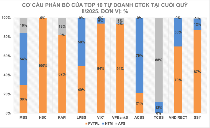 Một điểm đáng chú ý trong quý II là sự thay đổi trong danh sách Top 10 công ty chứng khoán có giá trị tự doanh lớn nhất. Các tên tuổi quen thuộc VPS, Vietcap và SHS đã rời bảng, nhường chỗ cho HSC, MBS và LPBS. Trong số này, cả MBS và LPBS đều có tỷ lệ phân bổ vào HTM ở mức cao – lần lượt là 54% và 50%.