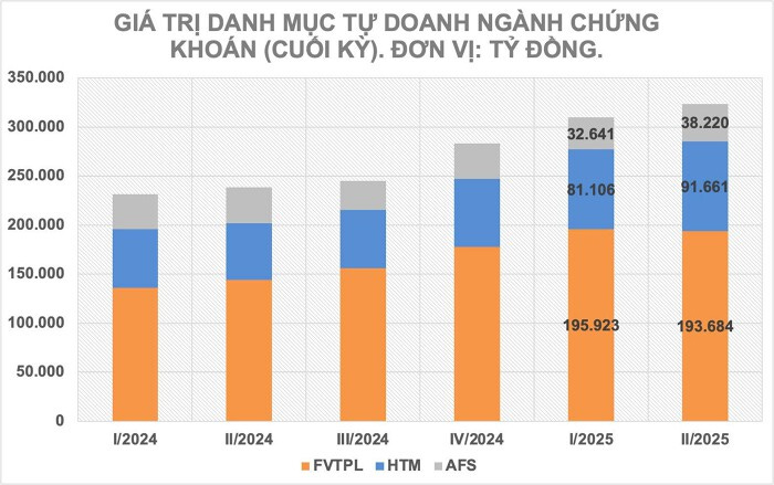 FVTPL tiếp tục là loại tài sản chiếm tỷ trọng lớn nhất trong danh mục tự doanh của toàn ngành, nhưng không còn duy trì được đà tăng như các quý trước. Tính đến cuối tháng 6, nhóm tài sản này đạt gần 193.700 tỷ đồng, chiếm gần 60% tổng danh mục, song đã giảm khoảng 1% giá trị so với cuối quý I.