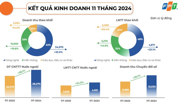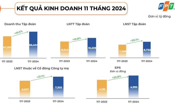 Năm 2024, tập đoàn đặt mục tiêu doanh thu 61.850 tỷ đồng, lợi nhuận trước thuế 10.875 tỷ đồng. Như vậy, sau 11 tháng, FPT thực hiện được hơn 91% chỉ tiêu doanh thu và 94% kế hoạch lợi nhuận năm.
