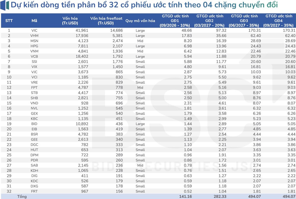 Ở góc độ kỹ thuật, việc các giai đoạn sau chiếm tỷ trọng lớn đồng nghĩa với việc các ETF sẽ phải thực hiện điều chỉnh danh mục với quy mô lớn hơn đáng kể trong năm 2027. Điều này có thể kéo theo sự gia tăng giá trị giao dịch tại các cổ phiếu đáp ứng tiêu chí về vốn hóa, thanh khoản và tỷ lệ cổ phiếu tự do chuyển nhượng.