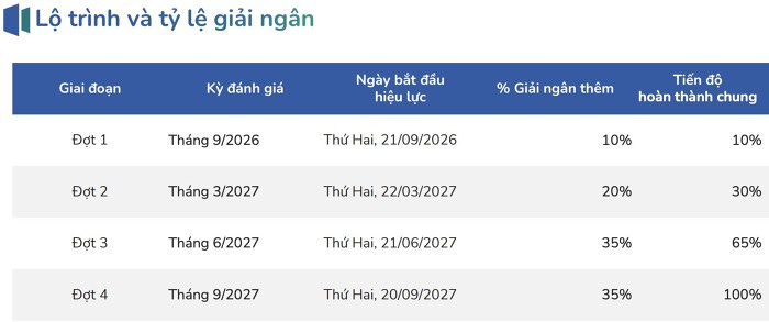 Theo các tính toán trong báo cáo, hai đợt triển khai vào tháng 6 và tháng 9/2027 chiếm khoảng 70% khối lượng vốn mục tiêu. Điều này cho thấy phần lớn dòng tiền dự kiến sẽ tập trung vào các giai đoạn sau của lộ trình.