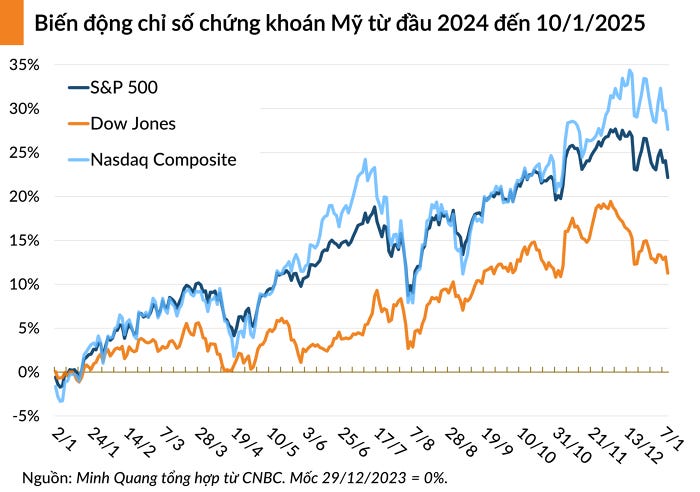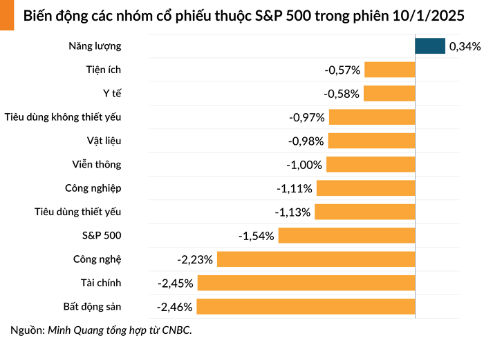 Theo CNBC, trong phiên giao dịch ngày 10/1, chỉ số trung bình công nghiệp Dow Jones đã mất 697 điểm, tương đương 1,63% và đóng cửa ở mức 41.938 điểm. Chỉ số S&P 500 trượt 1,54% xuống 5.827 điểm. Tương tự, chỉ số thiên về công nghệ Nasdaq Composite giảm 1,63% và kết thúc với 19.162 điểm. Kết quả phiên 10/1 đã đẩy cả ba chỉ số chính xuống thấp hơn so với đầu năm.