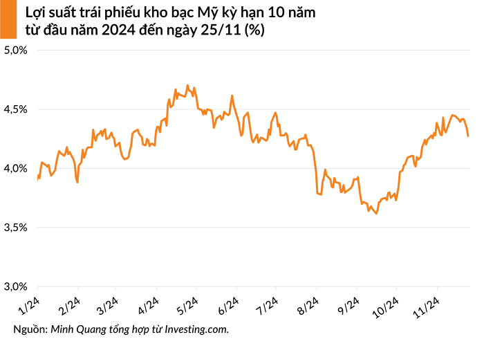 Ngoài ra, lợi suất trái phiếu kho bạc và chỉ số USD (DXY) đã giảm trở lại sau khi ông Bessent được lựa chọn. Chốt phiên 25/11, lợi suất trái phiếu kho bạc kỳ hạn 10 năm đã tụt xuống còn 4,275%, thấp nhất trong gần một tháng.