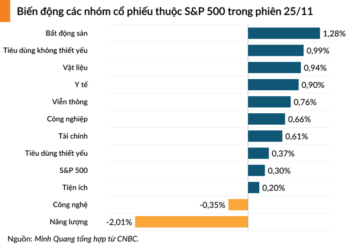 Ở chiều ngược lại, cổ phiếu công nghệ vốn hóa lớn lại gặp nhiều biến động, hạn chế đà tăng của Nasdaq Composite. Cổ phiếu Amazon và Alphabet (Google) đi lên, trong khi Nvidia và Netflix giảm.