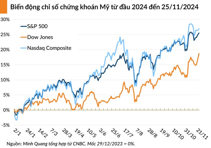 Theo CNBC, trong phiên giao dịch ngày 25/11, chỉ số trung bình công nghiệp Dow Jones bật tăng 440 điểm, tương đương 0,99% lên 44.737 điểm. Tương tự, chỉ số S&P 500 tiến thêm 0,3% và kết thúc với 5.987 điểm. Cả hai chỉ số đều chạm mức đỉnh mới vào giữa phiên và Dow Jones đóng cửa với kỷ lục mới.