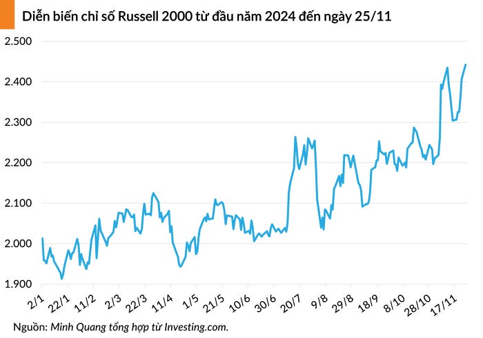 Ngoài ra, chỉ số cổ phiếu vốn hóa nhỏ Russell 2000 cũng tăng 1,47%, vượt qua đỉnh lịch sử từng thiết lập vào giữa năm 2021.