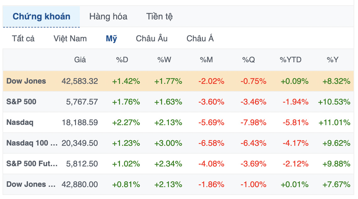 Kết thúc phiên giao dịch ngày 24/03, chỉ số Dow Jones tăng 597.97 điểm (tương đương 1.42%) lên 42,583.32 điểm. Chỉ số S&P 500 tiến 1.76% lên 5,767.57 điểm, còn chỉ số Nasdaq Composite cộng 2.27% lên 18,188.59 điểm.
