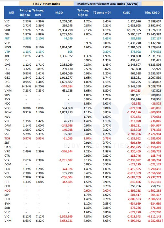 BSC dự báo cả hai quỹ FTSE ETF và VNM ETF sẽ mua vào nhiều nhất ở SHB (34 triệu cp), EIB (15.2 triệu cp), DXG (4.6 triệu cp), MSN (3.3 triệu cp) và HPG (3 triệu cp).