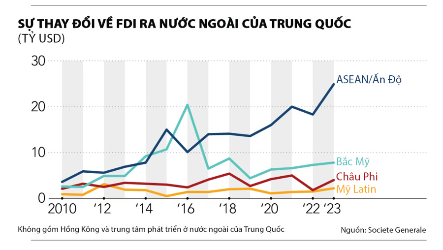 Cuộc chiến thương mại Mỹ-Trung từ năm 2018 đến nay là một nhân tố quan trọng thúc đẩy xu hướng này khi thúc đẩy nhiều nhà sản xuất dịch chuyển một phần sản xuất của mình từ Trung Quốc sang các quốc gia thứ ba rồi xuất khẩu thành phẩm sang Mỹ. Trong đó, Đông Nam Á là một trung tâm chủ chốt với dòng vốn đầu tư từ Trung Quốc từ Trung Quốc vào Hiệp hội các quốc gia Đông Nam Á (ASEAN) hậu đại dịch tăng vọt lên mức cao nhất lịch sử 17 tỷ USD năm 2023. Con số này tăng từ mức chưa tới 4 tỷ USD năm 2010.