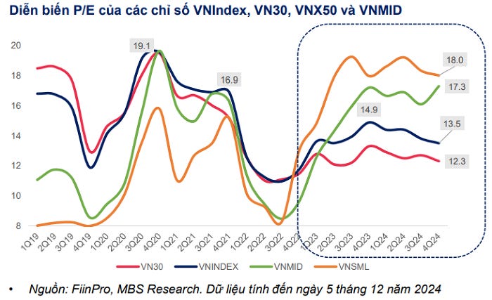 Trong kịch bản cơ sở, với mức tăng trưởng 18% lợi nhuận của các doanh nghiệp niêm yết, và định giá 12,5 - 13 lần P/E, MBS kỳ vọng VN-Index sẽ đạt 1.400 – 1.420 điểm trong năm 2025.
