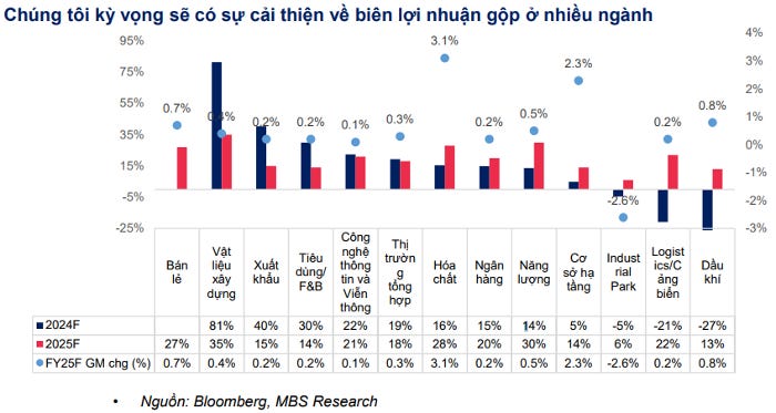 Trong khi lợi nhuận năm 2024 chủ yếu được thúc đẩy bởi tăng trưởng doanh thu so với nền thấp của năm 2023, việc cải thiện biên lợi nhuận gộp sẽ là yếu tố then chốt cho tăng trưởng năm 2025. Giữa bối cảnh lãi suất giảm, chi phí đầu vào thấp (giá dầu Brent, hàng hóa...) và mức tăng lương vừa phải, biên lợi nhuận gộp của nhiều ngành dự kiến sẽ có sự cải thiện đáng kể.
