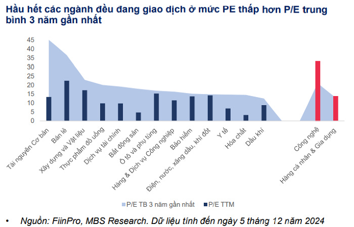 Xét theo nhóm ngành, nhiều nhóm ngành đang có định giá P/E thấp hơn so với trung bình 3 năm gần nhất, mở ra nhiều cơ hội đầu tư tích lũy các cổ phiếu của các doanh nghiệp đầu ngành.