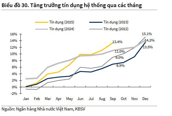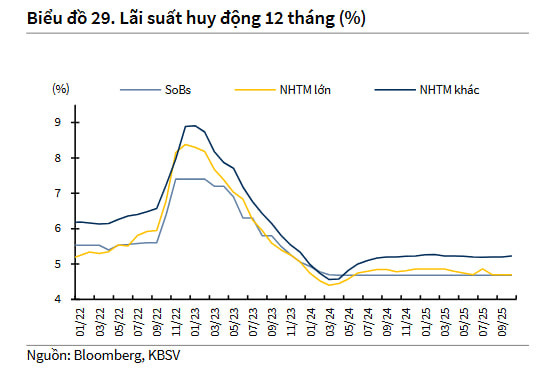 Theo khảo sát của KBSV, mặt bằng lãi suất cho vay tại nhiều ngân hàng đã chững lại trong vài tháng gần đây, sau giai đoạn điều chỉnh giảm mạnh từ đầu năm. Việc duy trì lãi suất cho vay thấp trong thời gian dài đã góp phần quan trọng vào đà phục hồi kinh tế trong 3 quý đầu năm 2025, đặc biệt ở các lĩnh vực sản xuất, tiêu dùng và bất động sản.