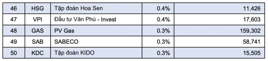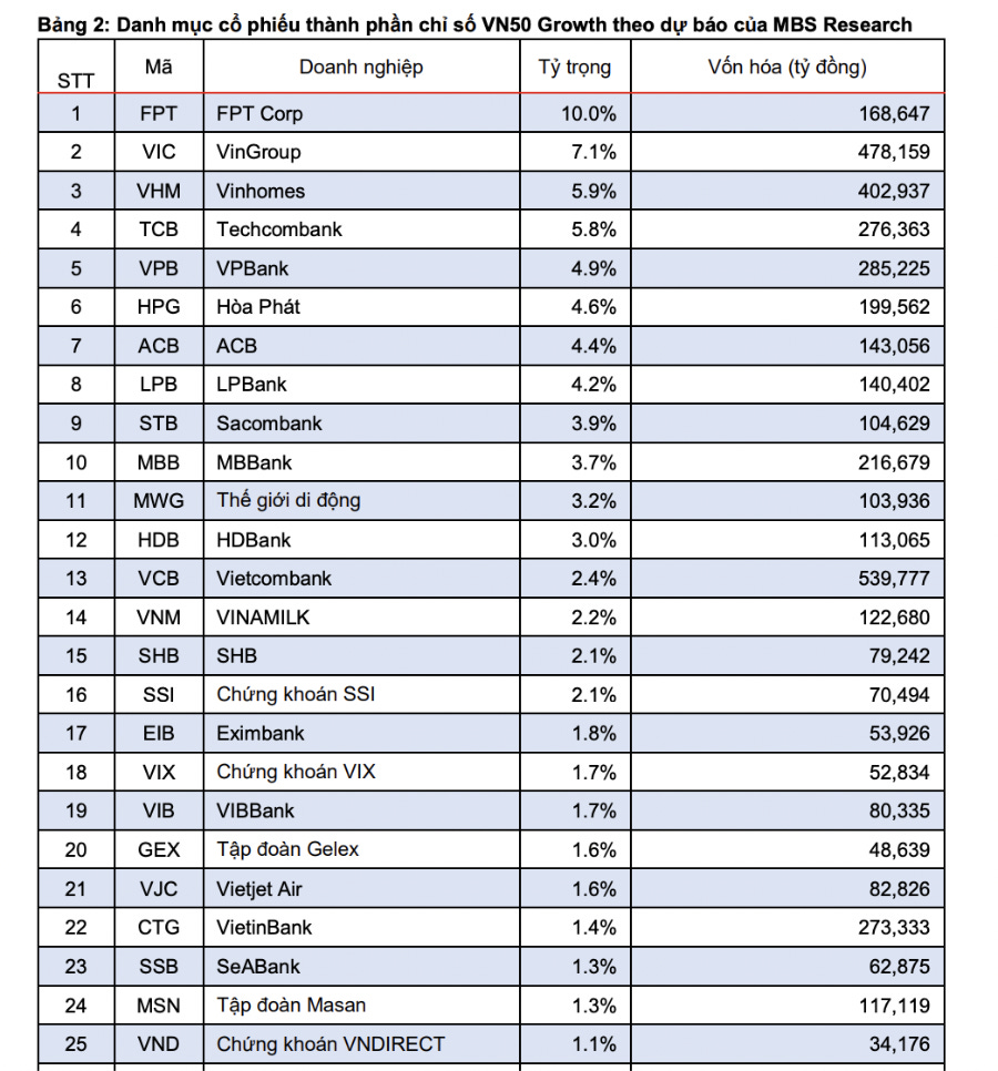 Dựa trên dữ liệu Chứng khoán MBS ước tính đến ngày 22/8, Top 5 cổ phiếu có tỷ trọng lớn nhất trong VN50 Growth bao gồm: FPT, VIC, VHM, TCB, VPB chiếm 33% tỷ trọng vốn hóa. Chỉ số VN50 growth ước tăng 36,71% kể từ đầu năm so với mức tăng lần lượt 29,6% và 31,1% của VN-Index và VN30.