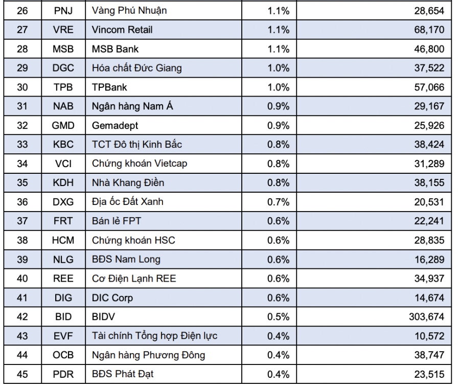 Từ đó, 50 cổ phiếu có giá trị vốn hóa lớn nhất sẽ được chọn vào rổ chính thức, 10 cổ phiếu tiếp theo sẽ vào danh sách dự phòng. Tỷ trọng vốn hóa giới hạn 10% cho mỗi cổ phiếu và 40% cho nhóm cổ phiếu cùng ngành (phân ngành GICS cấp 1).