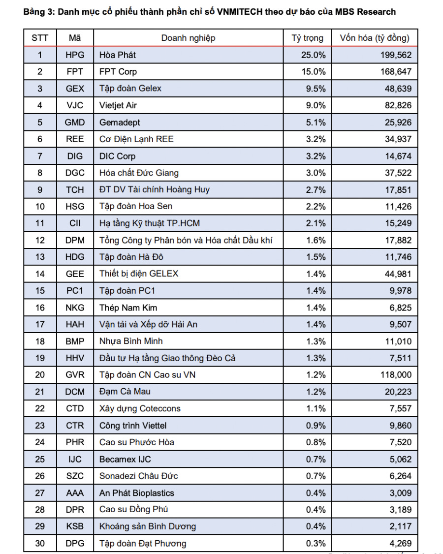 Dựa trên dữ liệu MBS ước tính đến ngày 22/8, Top 5 cổ phiếu có tỷ trọng lớn nhất trong VNMITECH bao gồm: HPG, FPT, GEX, VJC, GMD chiếm 64% tỷ trọng vốn hóa. Chỉ số VNMITECH tăng trưởng 13,9% kể từ đầu năm so với mức tăng lần lượt 29,6% và 31,1% của VN-Index và VN30.